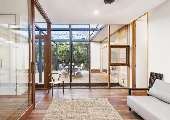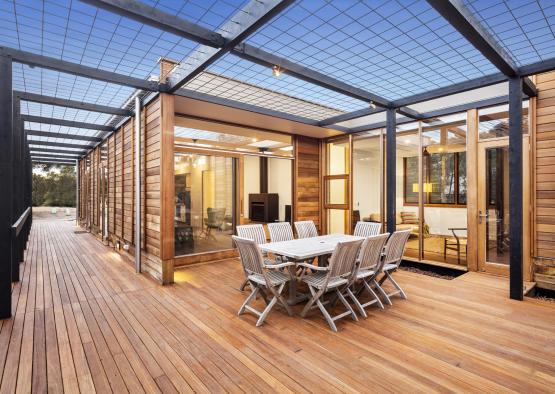 This factory constructed beach house utilises natural materials to provide a warm family getaway with sophisticated sustainability elements.