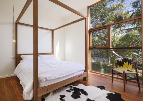 Crafted from a suite of robust, environmentally friendly materials the house is externally clad in western red cedar and blackbutt, with WRC windows and doors, hoop pine joinery, spotted gum engineered timber flooring, low/no VOC finishes, blackbutt decks and pine pergola. Siting considerations included minimising impacts to the existing vegetation and maximising privacy. The project scope included revegetation of the site with indigenous plant species.