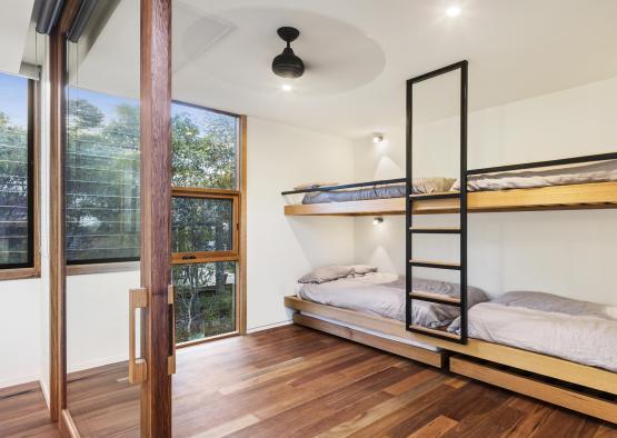 An outdoor shower and secondary entrance provide an opportunity to wash off from the beach before heading inside. A bunk room complete with custom designed trundle beds creates accommodation for six and the adjacent spill out space gives kids a room of their own to camp, play and explore.