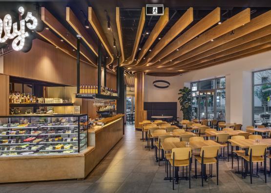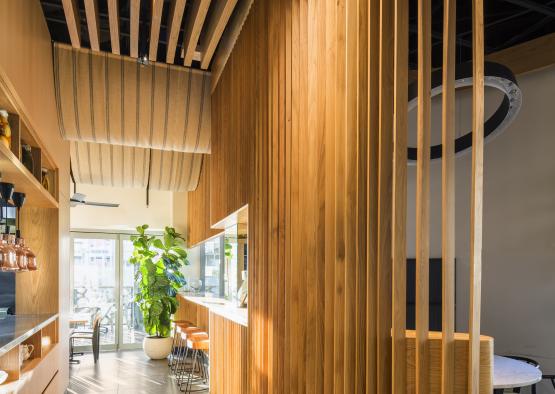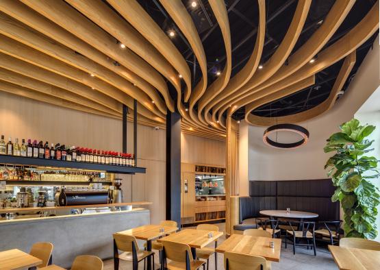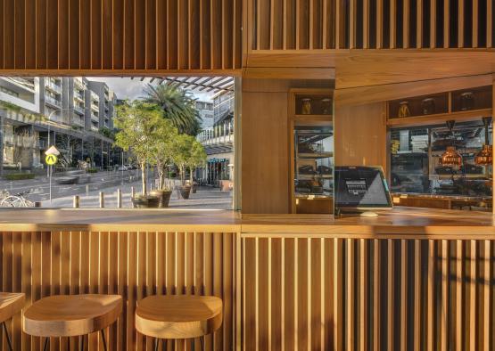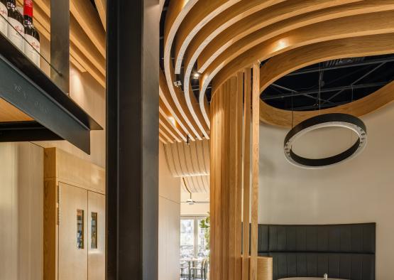 Lilly's Espresso e Cucina, the 2016 ATDA Decorative Sliced Veneer Winner, features an interior fitout with striking sliced veneers and a fluid form design.