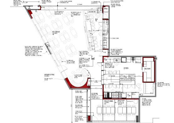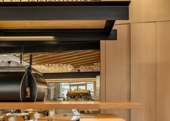 The timber elements of the fit-out provide the material warmth and colour for the restaurant walls. The fit-out reimagines an element generally perceived to be rigid as a more fluid form. Large veneered panelled walls that make up the cladding to the shopfront, the bar, and the kitchen, assisting to conceal or reveal as required. Frame mirrored walls extend the space. Using veneered board, edged and spaced with steel edge allowed the floor to meet the ceiling in a single material finish. Lighter coloured timber veneer was used to create a clean look and create the impression of solid timber.