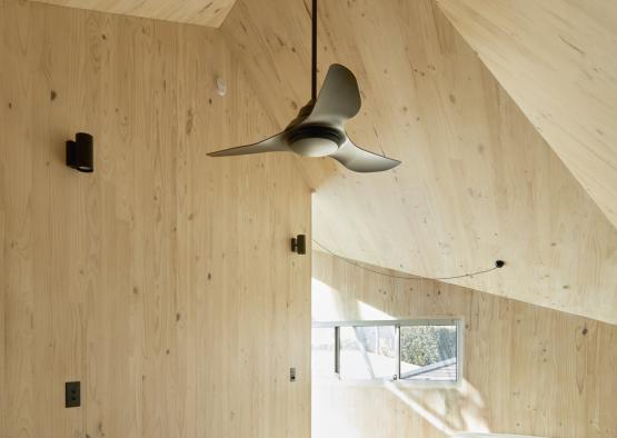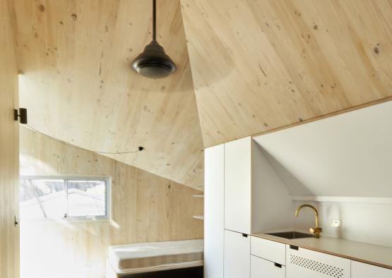The inner feeling highlights the quality of light that can be achieved with CLT. Given its pale tone, the pine provides a very warm, reflective light that creates a beautiful ambience in the small spaces.