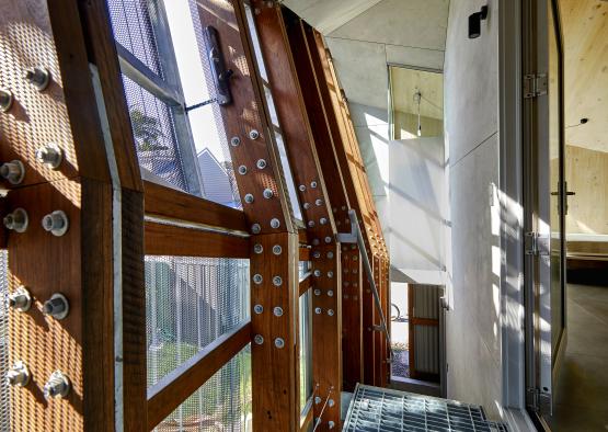 The remainder of the structural elements come by way of a resource-driven, sustainable approach of material reuse. Recycled timber was salvaged for the circulation space, and brings a contrasting character to the light, sleekness of the CLT. The recycled timber vertical verandah is constructed of a column pair of 140x145mm F27 hardwood timbers, that have been H3 treated. A flitch plate provides a moment connection at the angled joint.