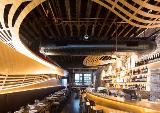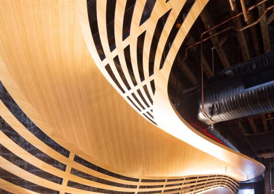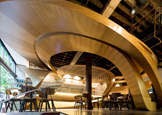 The brief was to design a distinctive space for the client’s debut as restaurateurs at LOT.1 restaurant/bar and café, located in a late Victorian warehouse. Up until now the client has been known for roasting its own blends for over three generations. Fluidity to Form inspired this design as the timber veneers were the catalyst for a concept driven by the patterns baristas create on a café latte. With the café latte as the inspiration for the design, the firm interpreted the everyday, familiar coffee swirl pattern and transformed that into a fully functioning venue. The café latte was emulated to create the apparently seamless curves of timber veneer which spans over the entire 945m2 venue.