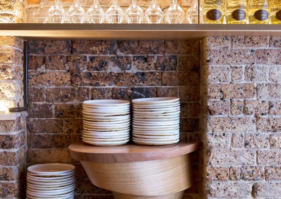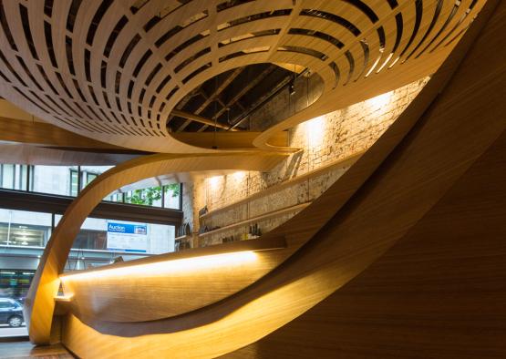 Australian timber veeners join seamlessly to circulate, unfold and connect all of the functions of the venue while providing a journey through the historic Sydney interior. The contemporary timber form layers the existing fabric of the building – principally exposed brick, sandstone walls, wooden columns and old steel work, all serving the building during its many stages, and all integral to the rich, original tapestry.