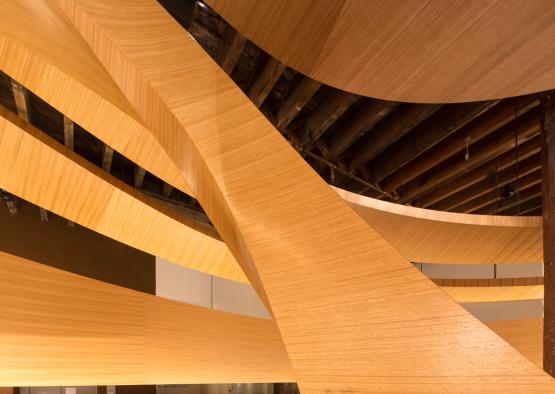 It was essential that the selected veneers were flexible enough to be manipulated into non-orthogonal geometry while being durable enough to withstand the busy commercial environment. The firm worked mostly with 3D modeling and laser cutting technology to create the timber forms ‘sweep and motion’ throughout the site. The firm opted to use timber veeners for its physical properties, namely; Tasmanian Southern Blue Gum & Tasmanian Wattle Silver Veneer.