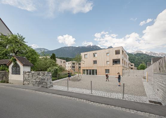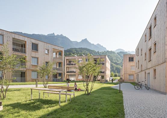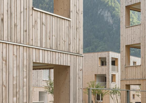 A new housing development in the Austrian alpine town of Bludenz creates a village out of simple timber cubes.