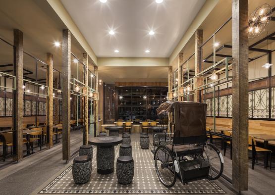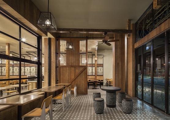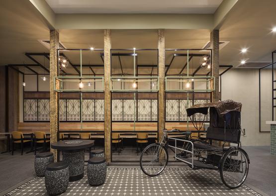 Through the extensive deployment of recycled smoked timber as a visual indicator, the space is sub-divided into a vestibule, a courtyard and the main dining area sequentially. The vestibule signifies the old Malaccan sheltered walkway while introducing a warm ambience accentuated by the smoked Iron Bark wall cladding. The hardwood radiates a dark red to greenish hue which is the characteristic of the robust timber. Hairline-joints were incorporated with large areas of glazing.