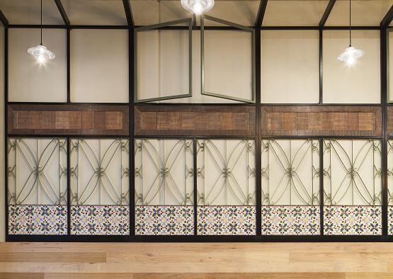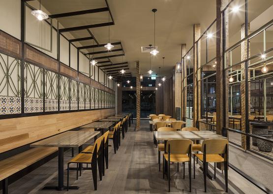 The vestibule, which leads to the main seating area, is continuously back-dropped by Tasmanian oak lining-board of light browns to creamy hues; the timber humanises the dining environment, and imparts a sense of hygiene through its clean finish. Tasmanian oak was also applied on table tops and the backdrop behind the seating area. The Tasmanian oak was grinded and smoked to create crack lines and expose the timber grain in order to assigns the chronological significance of the timber to the ambiance of the space.