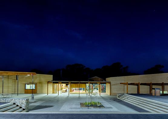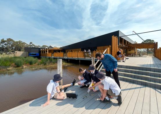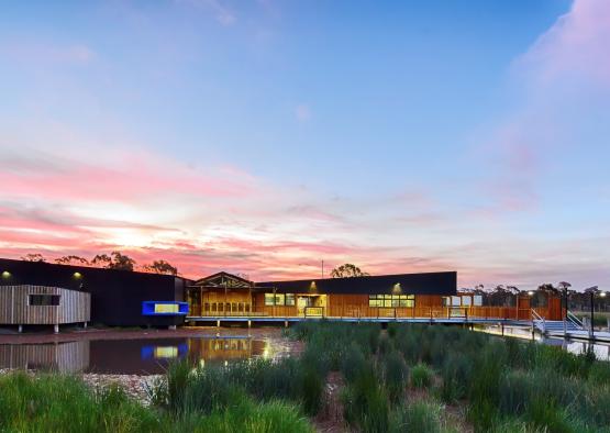 The use of rammed earth walls not only anchors the building to the site as it floats over the wetlands, but their thermal mass properties regulate the temperature in the varying learning spaces inside. A natural theme of eucalyptus greys/greens and ochre reds/browns are accentuated with textured timbers internally and externally to create a warm and welcoming ambiance that gracefully define various zones and spaces.