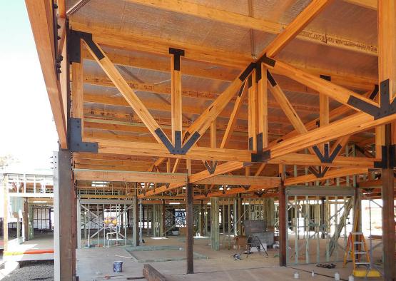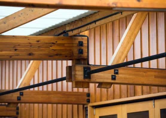 Throughout the Montagne Centre, there are numerous examples of recycled timber used as elegantly exposed structural elements. Internally, the structural grid is mapped out with 150sq/250sq Ironbark and Spotted Gum recycled telephone poles. The recycled timber posts support the exposed primary and secondary Glulam timber trusses.