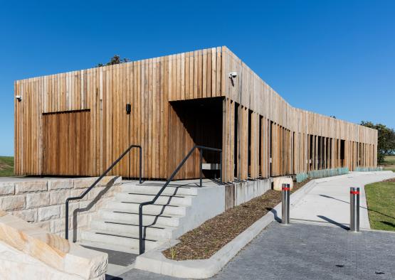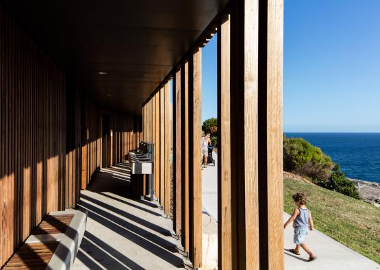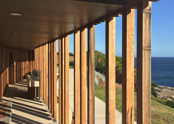 The amenities have been significantly upgraded and reconfigured to increase the capacity of male and female toilets. The original building has been clad with recycled hardwood posts and a veranda added to provide shelter from the elements. The timber skin will weather naturally in the harsh salt, sun and wind of the exposed headland, and settle overtime into the muted silver tones of the nearby banksia scrub and sandstone escarpment.