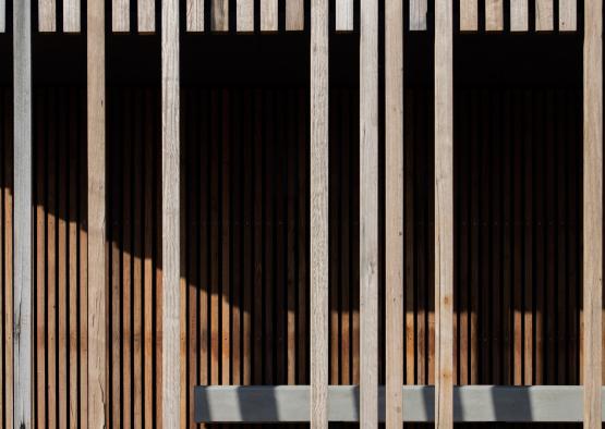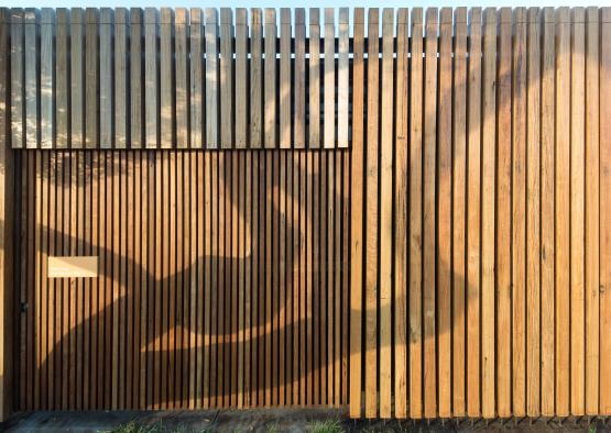 Two timber profiles were used. On the exterior of the building, 85x85mm hardwood battens were used with 40mm spacing, running from the ground to above the roofline. The wall of the amenities along the verandah and access doors are clad with 40x40mm hardwood battens with 20mm spacing’s. The thinner battens sit in contrast with their larger counterparts whilst maintaining the buildings singular language.