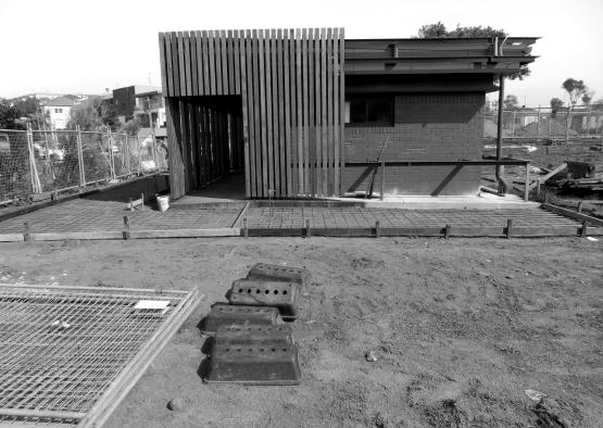 The timber posts that now wrap the building were fortuitously discovered by the architects during a client meeting at the Waverley Council Works Depot at Zetland, now demolished to make way for Green Square Town Centre. The works depot comprised warehouse buildings, likely built in the 1940s, framed with mixed Australian hardwoods including blackbutt and tallowwood. Waverley Council had contracted a demolition company to bulldoze and remove the buildings as soon as possible. With some cajoling, the demolition crew were convinced to set aside the timber for pick-up by a salvage company who would keep timbers surplus to the project’s requirements as long as they supplied the project with free freshly milled recycled timbers to specification. The completed outer façade has now been left to weather naturally, allowing the building to gain a richness over time – a building now worthy of its surrounds.