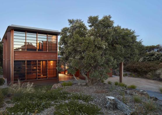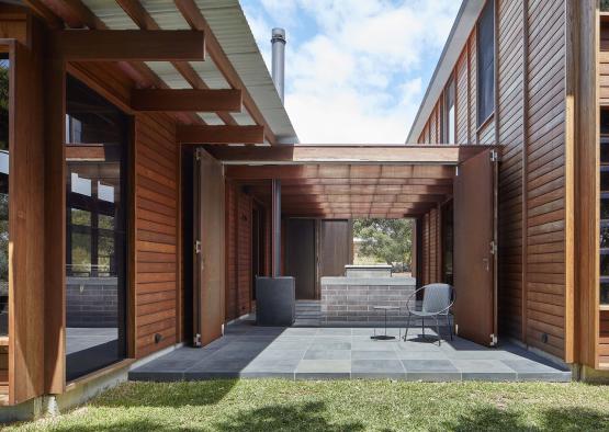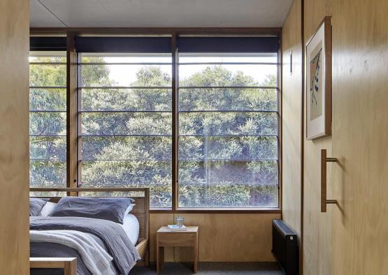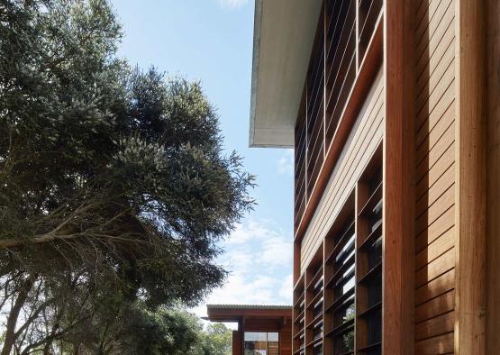 White mahogany timber cladding is used externally and was selected due to its character – not un-similar to Blackbutt, which is used as the primary timber element. It provides for a very high performance timber overall, especially in a fire prone, harsh coastal environment. Recycled Blackbutt timber windows are used throughout. All fixed glazing has been site-glazed into timber columns. Core-ten lourves and fins have been used on all north, south and west windows for privacy and to allow winter sun to penetrate into the rooms but block summer sun.