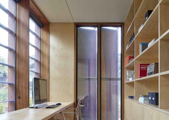 Hoop pine plywood is shown extensively in this dwelling, it is expressed with a Blackbutt hardwood timber batten to encase the internal spaces. It serves to enhance the informal no-fuss material palette. The light tones and textural qualities of the Hoop Pine Plywood add a subtlety that compliments the use of Recycled Blackbutt timber, along with the burnished concrete floors and cement sheet ceilings. The finesse of the timber detailing and craftmanship of the timber collectively showcase timbers attributes in a modest but measured manner.