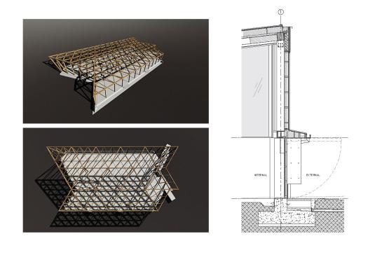 The diagrid roof structure was another example of waste minimisation through design. The diamond structure was infilled with triangular plywood ceiling panels. These were designed and detailed to be cut from a single 2.7m x 1.2m plywood sheet, cut into multiple triangles to fit snuggly into the structural opening.
