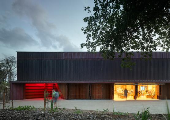 Marine plywood panelling was also used on the exterior for public event spaces. The robust and corrosive resistant material is suitable for a high use, public space, as it contains exterior grade glues and higher quality plys. The plywood was prefinished with a dark stain when delivered to site.