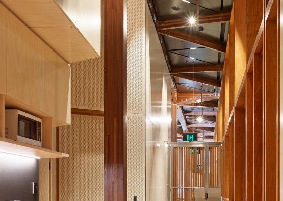 Externally the building is wrapped in both copper and recycled tallowwood cladding. The copper wraps the upper half of the exterior, while the tallowwood provides the human scale cladding- where tactility and warmth is key.