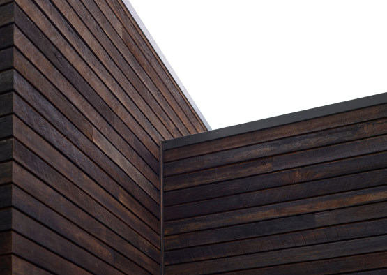Secret fixing was used for the spotted gum cladding. The meticulous approach of the builder ensured a clean, linear detailing of the recycled material . A 75 x 19mm rough sawn board was used, coated in a ‘charred black’ stain.