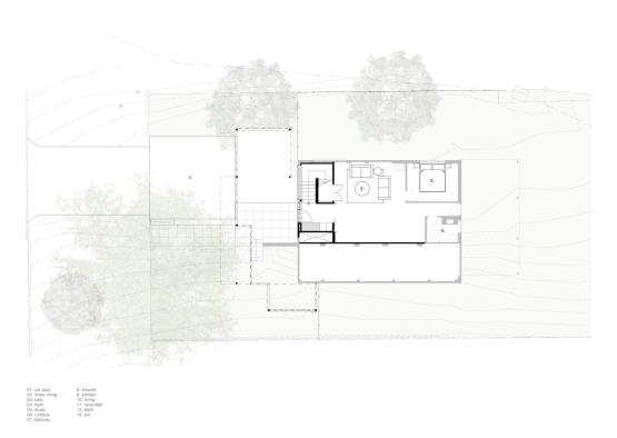 Timber cladding became a lightweight solution, which reinforced the imagery of a simple form designed to hover in the landscape, creating a sense of living amongst the canopy of the large Jacaranda to the street. The striking, low-maintenance material accents the surrounding greenery.