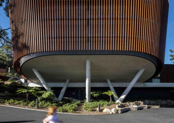 The linear external timber batten façade and landscape screening provide a strong architectural response, embracing the unique site and playing with ever-changing shadows cast by large fig trees.