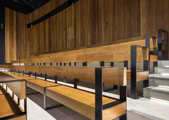 Interior Panelling: The rear of the theatre features a solid timber wall lining system. The cladding system was also mounted on doors and window coverings. 250x39mm internal tongue and groove cladding was used, finished in Cutek Extreme Clear.