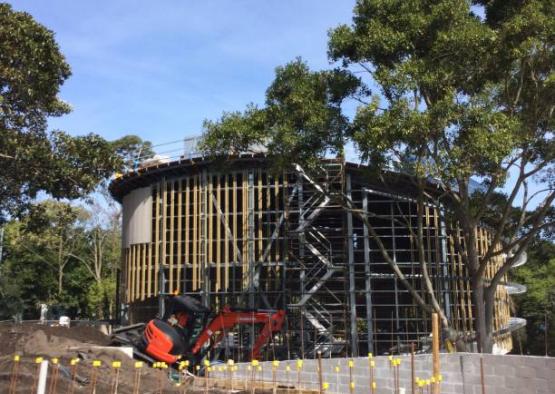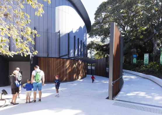 Raw materials used throughout the project include honed concrete, blackbutt timber cladding boards and oversized battens, mild steel plate cladding to vestibules and textured fibre cement panelling. Such materials are also reflected internally with tongue and groove blackbutt lining boards and blackbutt veneer on custom designed seating benches, further connecting visitors to the wider zoo environment.