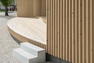 The elliptical shape of the pavilion was designed to complement its natural surrounds, suiting the garden environment. The artists' entrance is provided by another ellipsis towards the rear, built from the same silver fir. The entire structure is designed to best complement the natural environment and the auditory requirements of the performances. Without an enclosed space, creating an ideal acoustic environment is not possible, but within the limits that the commission entailed the architects were able to maximise the possibilities of the space.