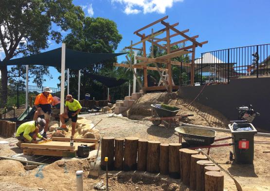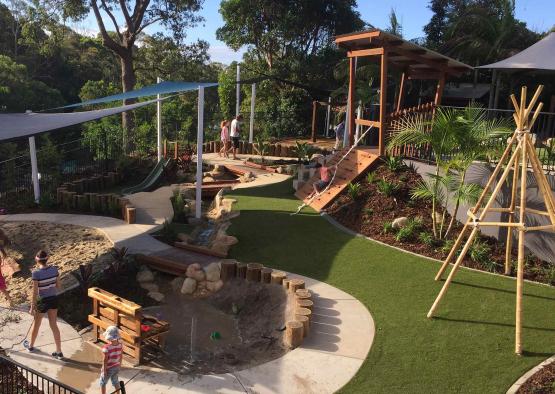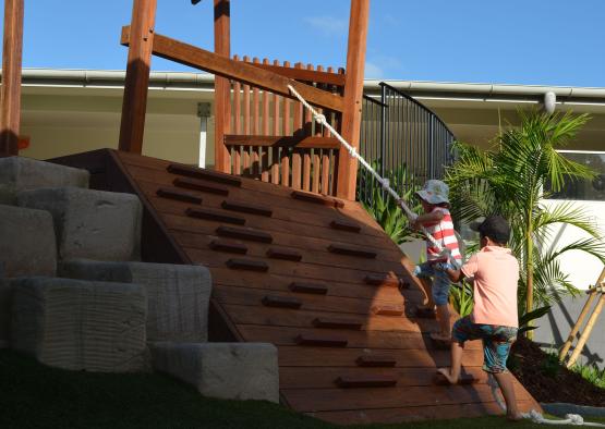Greenedge Design wanted to provide a subconscious connection with the surrounding natural forest by utilising native Australian timbers. Spotted Gum, with a Class 1 Natural Durability Rating, was used in the majority of the timber elements, with structural treated pine being used to construct visually hidden load bearing joists within the lookout, tree house and bridge structures. The inclusion of a fallen timber climbing tree – a Queensland Pepper Tree sourced by Greenedge Design through a forestry not-for-profit organisation – was obtained from the local area together with the rounded natural logs used for steppers and retaining walls.