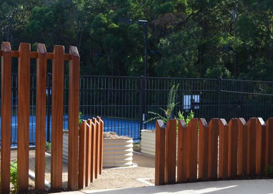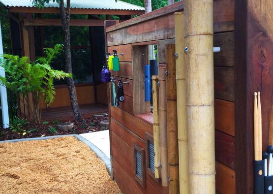 The nature play theme informed a natural materials palette with a strong representation of timber in the design due to its versatility and flexibility in creating unique structures and play elements. The decision to focus on timber was strengthened through the constraints of difficult site access and the presence of a wonderful forested backdrop. One of the key design challenges was to unify the play space, which consisted of two terraced areas divided by an existing retaining wall. The opportunities to connect the spaces by bridging the wall developed the design of a timber lookout and climbing ramp that offers a physical challenge, an element of risk taking and the development of gross motor skills. In addition to the improved physical connections, the broad use of timber offered a visual unification of the spaces and a strong visual aesthetic. The design carefully considered child safety and referenced Australian Standards for playgrounds.