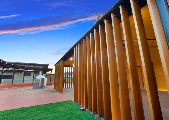 Externally, the use of Western Red Cedar on the studio outside gathering area, is designed to resemble the ‘windbreak’ found in a traditional aboriginal campfire community, familiar to the elders. The vertical timbers provide necessary shading to this semi outdoor gathering area whilst providing a warm backdrop.