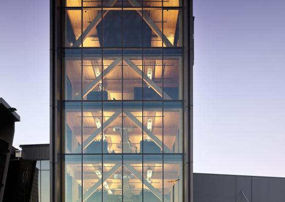 The entire building becomes a celebration of the beautiful, rational timber structure, by expressing the CLT finish throughout, and exposing the monumental timber K-braces through the glazed southern facade. Users are wrapped in a healthy biophilic environment of warm pine textures, complete with knots and imperfections, and accented by rich hardwood joinery and intricate detailing.