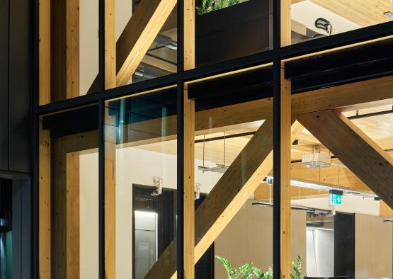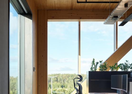 The loading bearing CLT walls throughout the external fabric of the building greatly improved the thermal and acoustic performance of the envelope. Instead of a typical continuous curtain wall facade flowing down the front, a gridded pine frame acts more like a series of large format windows. The result is a more domestic view through the window frames, framing soaring views across the city.