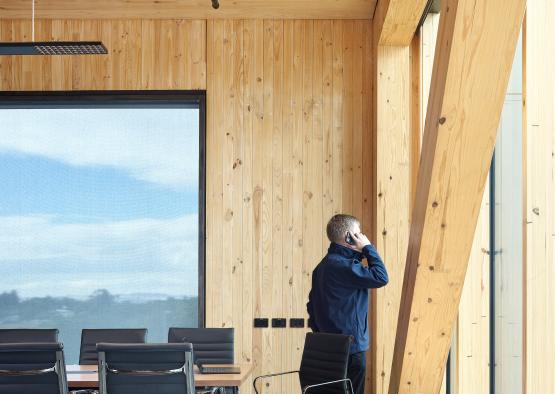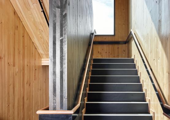 Stained finishes contrast beautifully with the raw CLT finishes. Plywood sheeting, pine doors and glazing, and a feature CLT blade wall through the stair shaft are all dark stained for contrast. Solid American walnut is used for joinery in the facilities gathering space, custom timber screening, hand railing and skirting boards throughout.