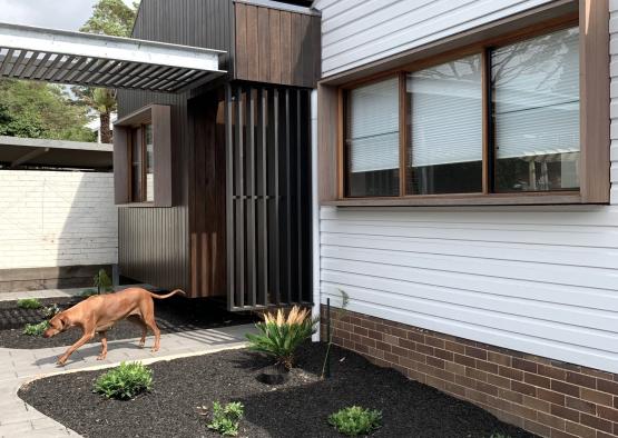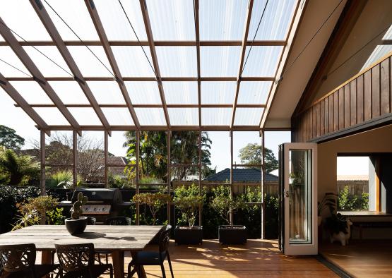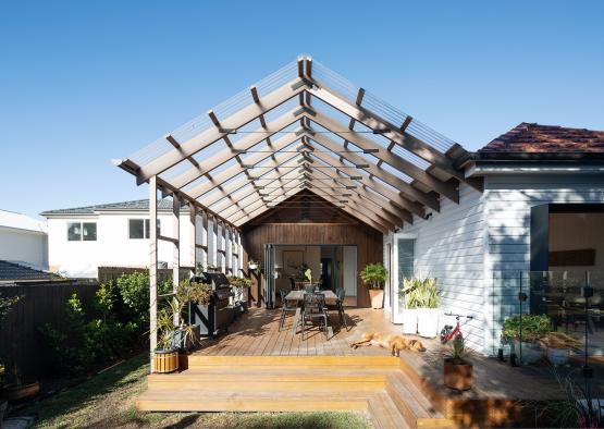 The vertical support for the blackbutt pergola is an expressed stud wall, left open for porosity, setting a rhythm and connection between house and garden. Blackbutt is a class 1 timber, so has excellent durability in exterior applications.