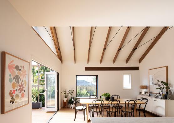 New forms are contrasted from existing using dark stained weatherboard cladding. Steel collar tie rods were chosen over timber as an architectural statement, but the gable rafters remain exposed within. The continuation of the vaulted ceilings from the dining room to the outdoor entertaining space, visually links the indoor and out.