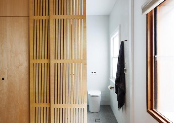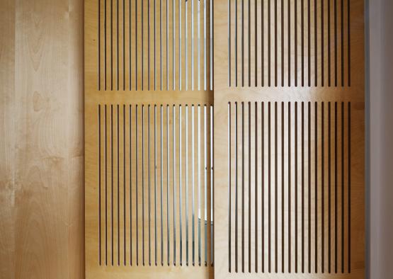 Birch plywood was cut with a CNC router to profile custom doors. The perforated plywood creates a privacy screen for the ensuite that slides away neatly against the birch fronted wardrobes.