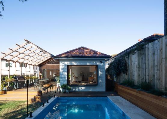The redesign called for the removal of lean-to roofs at the front and rear of the property. The hip roof form was extruded at the back into an open gable roof form, with the roof profile flowing seamlessly from inside to the outside pergola. The open gable form brings a dramatic height and lightness internally, while giving the exterior a clean and confident roof line.