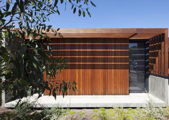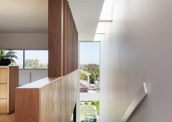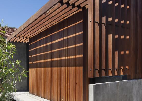 To the front façade, hovering Blackbutt sunshades protecting northfacing windows echo the vernacular verandah form so common in Northcote streetscapes. The rhythm of the sunshade battens is continued in the Blackbutt batten and lining board cladding, leading visitors to the heavy solid timber front door.