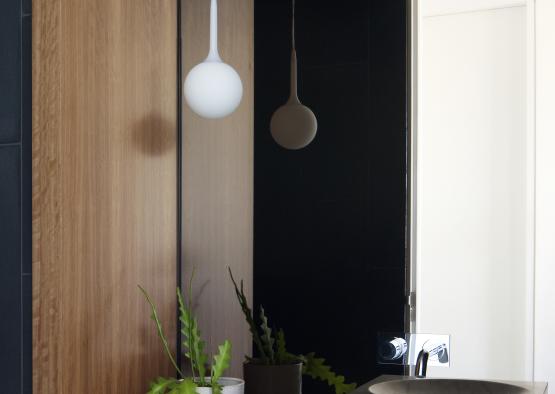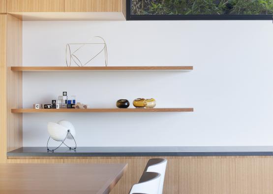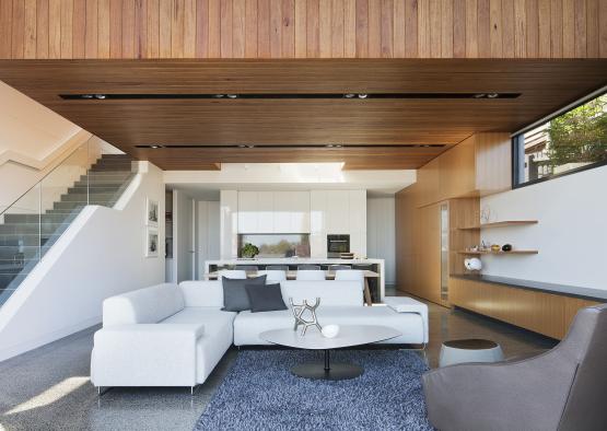 Inside, the external timber form experienced outside continues, leading down the stairs to the primary living and entertaining spaces. From here, this form is read from below, with the Blackbutt soffit lining providing intimacy and warmth to the voluminous space. Reclaimed solid Blackbutt and Blackbutt veneer incorporated into joinery elements further enhance the space.