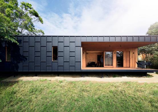 The warm timber deck lining contrasts with the dark exterior cladding, to create a peaceful and welcoming exterior environment.