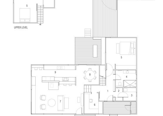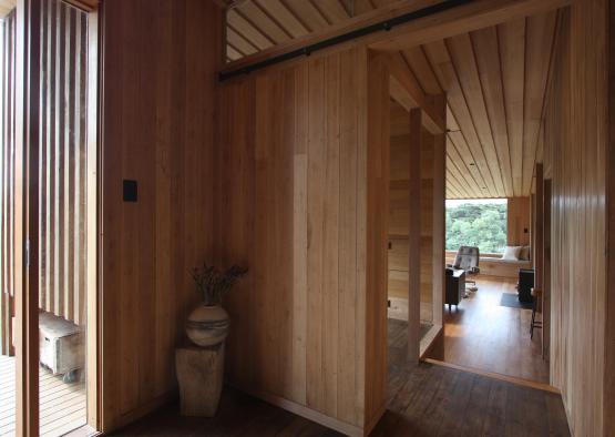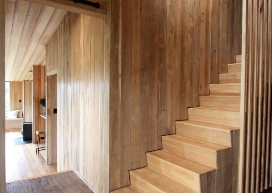 Yellow stringybark stairs are a feature of the entry way, with their smooth finish and light-yellow colour contrasting with rough sawn spotted gum vertical wall linings.
