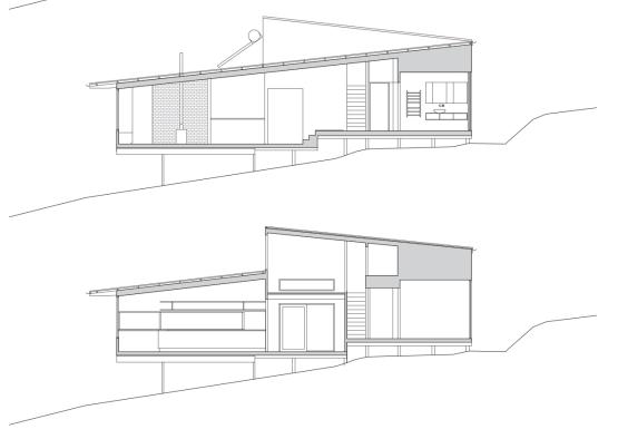 The Waratah House cantilevers boldly over the graduating landscape. The hovering form allows both minimal footprint on the natural landscape, and a bold visual statement. Using timber stumps instead of concrete lowered the embodied energy of the project, as well as minimising impact on the site. LVL bearers and joists were used to create the cantilever. The engineered timber provides increased structural potential over solid timber construction. The roof system was mainly LVL, with some solid timber, while the walls were pine studs.