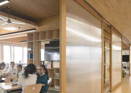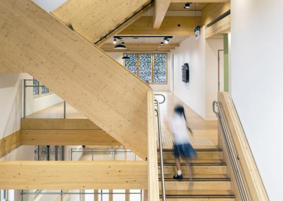 The material is left exposed on the ceilings and through the atrium, while some has been covered with fire rated plaster. The combination of light timber and plaster makes for an incredibly bright interior. The natural material is engaging for children, and represents a sustainable and natural use of building materials for educational purposes.