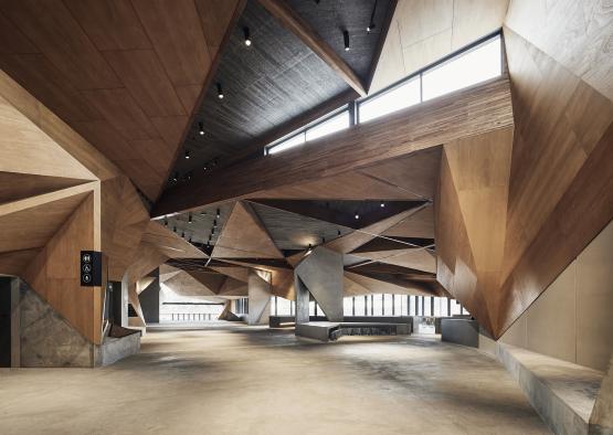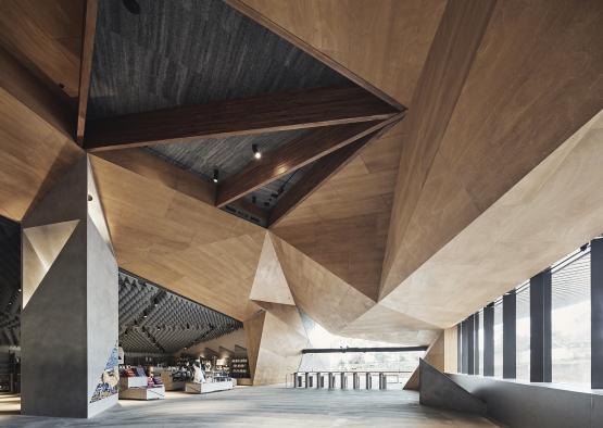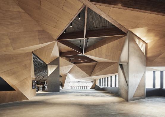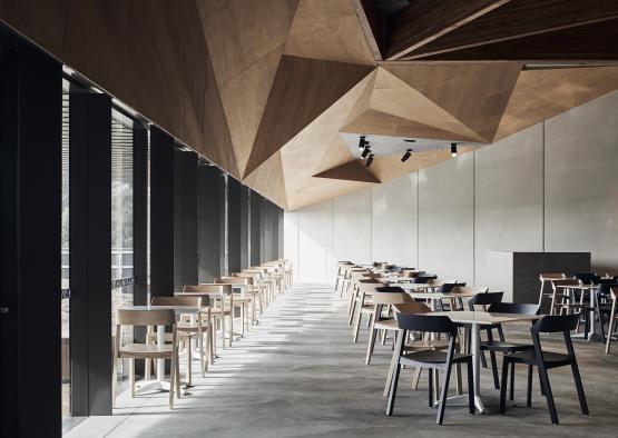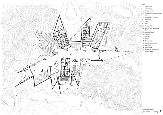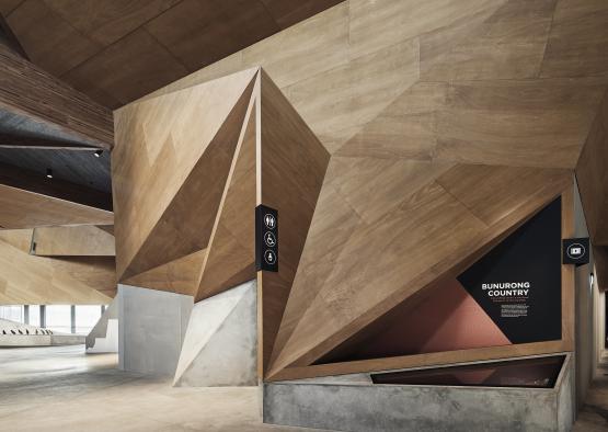 The beautifully lined timber interior is intended to be a dramatic contrast to the robust metallic form of the building's exterior. The timber alse creates a material continuity with the timber boardwalks and viewing platforms that feature on the penguin viewing side of the visitor experience. The natural appearance of the plywood compliments the natural finishes throughout, including the exposed concrete floors, walls and plinths.