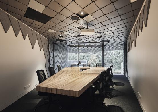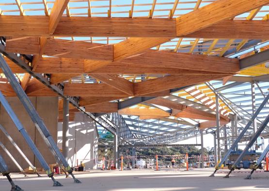 Laminated Victorian ash hardwood was used to create a hybrid steel/mass-timber roof structure with glulam beams. The laminated beams span up to 16m and are 900mm in depth. The mass timber creates a net structure over the space, with nested junctions of up to 7 intersecting beams. All of the structural glulam has been stained, infilled with plywood lining, and left exposed.