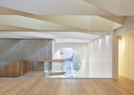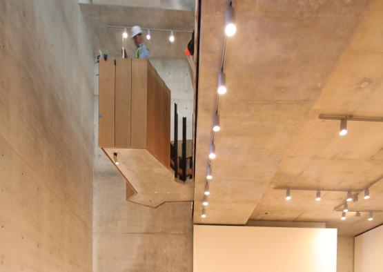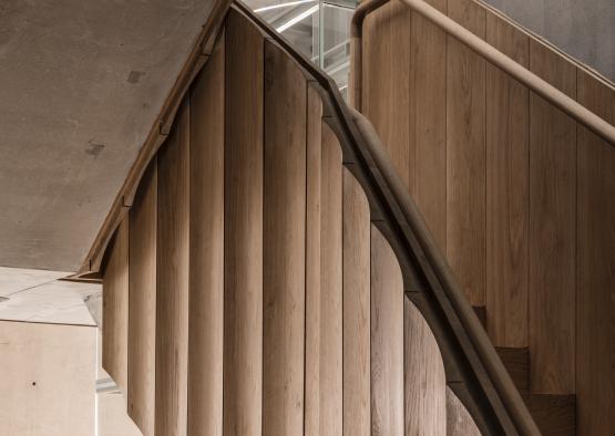 A dramatic stair clad in the same balustrade system hovers within the multi-level void to join the gallery’s upper two levels. Other solid timber panels are carefully sculpted for the display of art objects.