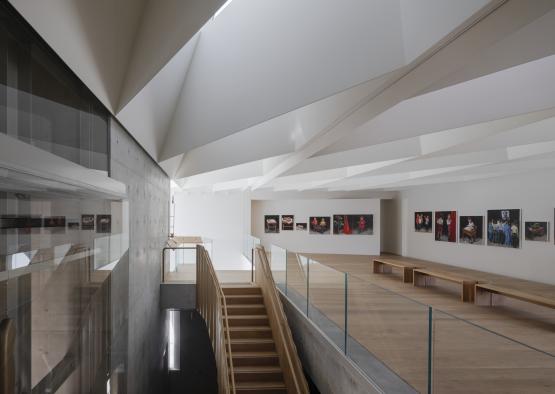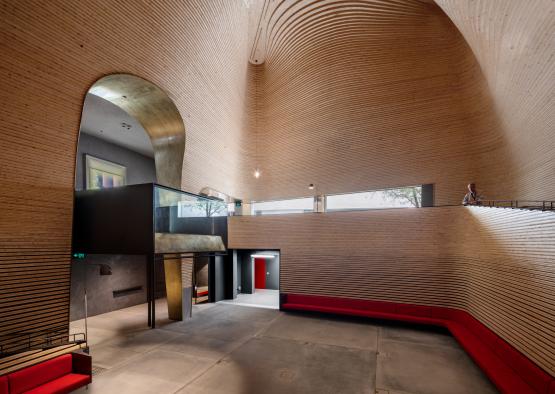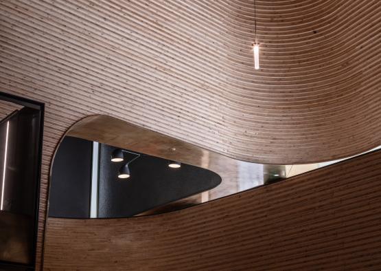 A gallery and performance space contrasts stark concrete walls with contoured CLT ribs and warm timber finishes.
