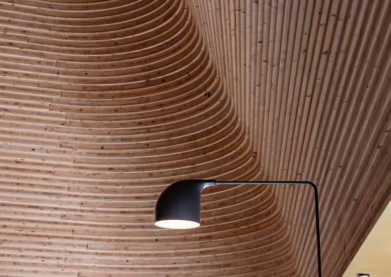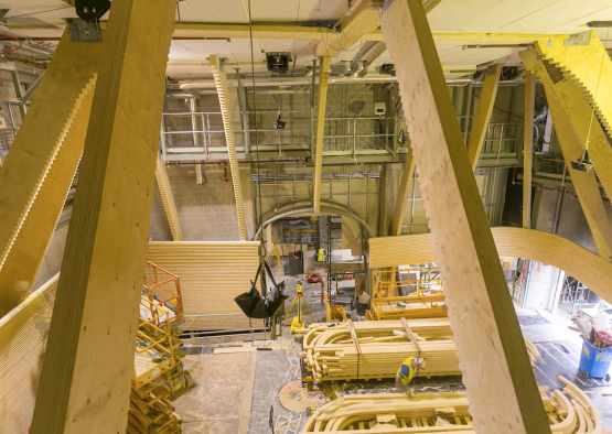 The theatre is entirely lined with CLT, fabricated from digital templates in the factory, and assembled on site. The support system is compromised of glulam beams, that have been notched to allow the CLT ribs to fit seamlessly into the structure. The majority of the contours are concealed fixed.
